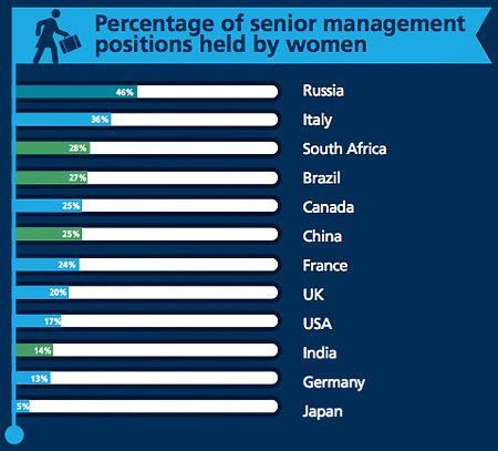В России, согласно результатам исследования, 46% руководящих постов занимают женщины, а, например, в Японии этот показатель составляет всего 5%. В России всего 5% работающих женщин имеют неполную занятость, тогда как в Великобритании 39%.