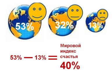 Общемировой индекс счастья за год не изменился и, как и в прошлом году, оказался на отметке в 40 процентных пунктов