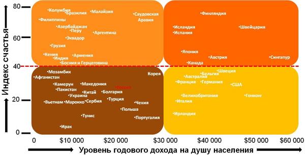 Соседями России в рейтинге счастья оказались Германия (37 п.), Франция (36 п.), США (34 п.), Македония (32 п.), Болгария и Камерун (по 30 п.).