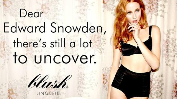 На этот раз они обратились со своих плакатов к бывшему сотруднику ЦРУ Эдварду Сноудену. Реклама построена на ловкой игре слов: «Дорогой Эдвард Сноуден, здесь всё ещё есть, что раскрывать». Однако компания Blush пошла дальше, опубликовав на своей странице в «Фейсбуке» сообщение: «Уважаемый Эдвард, береги себя! Мы с тобой!»