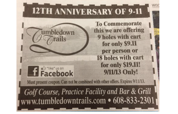 Гольф-клуб решил сделать подарок своим клиентам в честь 12 годовщины трагедии 11 сентября 2001 года. И предложил специальную цену на свои услуги, действительную только 11 сентября 2013 года: $9,11