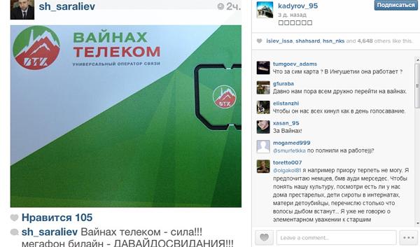 'Сегодня оператором для многих тысяч жителей Чечни стал ВАЙНАХТЕЛЕКОМ! Красивое имя, красиво звучит! И мы уверены, что будет надежно обеспечивать нас с вами устойчивой связью. Звонки внутри сети бесплатные, на номера других операторов 1.30, а в Америку можно позвонить всего лишь за 1 руб. в минуту. В регионы России минута разговора стоит 2.50 руб. у оператора достаточно симкарт в наличии. Мы не намерены и далее кормить МегаФон и Билайн', — пишет Кадыров на своей странице в Instagram.