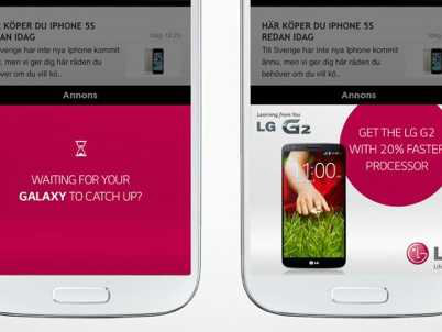 В рекламных объявлениях, автором которых стала шведская фирма M&C Saatchi, корейская компания смеется над гаджетами своих конкурентов.В частности, пользователи iPhone получают рекламное объявление, написанное мелким шрифтом. В нем задается вопрос, не слишком ли трудно такое читать, ведь 4-дюймовый дисплей Apple-телефонов якобы не может сравниться с экраном G2, диагональ которого больше на дюйм.