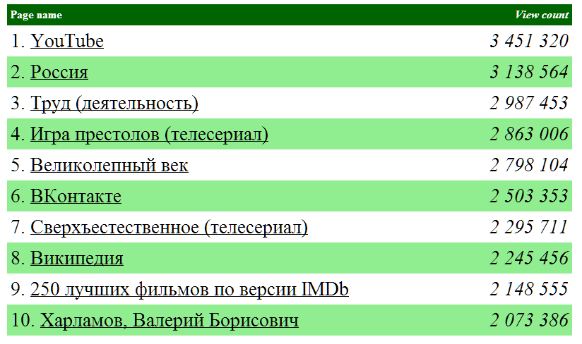 Лидерами по количеству просмотров в день стали разделы, посвященные социальным сетям 'ВКонтакте' и 'Одноклассники'. На третьей строчке идет статья о России, на четвертом — телесериал 'Игра престолов'.