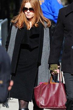 В письме с фотографиями американской актрисы Эми Адамс на похоронах Сеймура Хоффмана, компания отмечает наличие у актрисы сумки Valentino Garavani Rockstud Double из весенне-летней коллекции 2014 года.