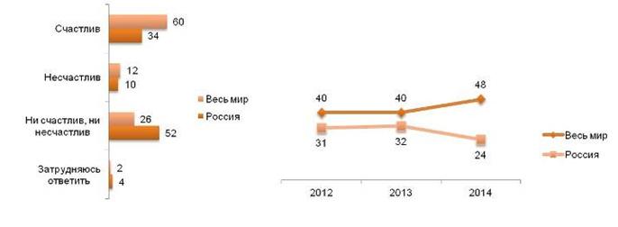 Диаграмма 1. Ощущаете ли Вы себя лично счастливым или несчастным человеком в связи с тем, что происходит в Вашей личной жизни? (%) Динамика индекса счастья в России и в мире 2012-2014 (п.п.).