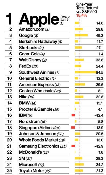 Замыкают десятку Walt Disney, FedEx, Southwest Airlines и General Electric. Занимавшая в прошлом году шестое место компания IBM оказалась сейчас на 16-й строчке.