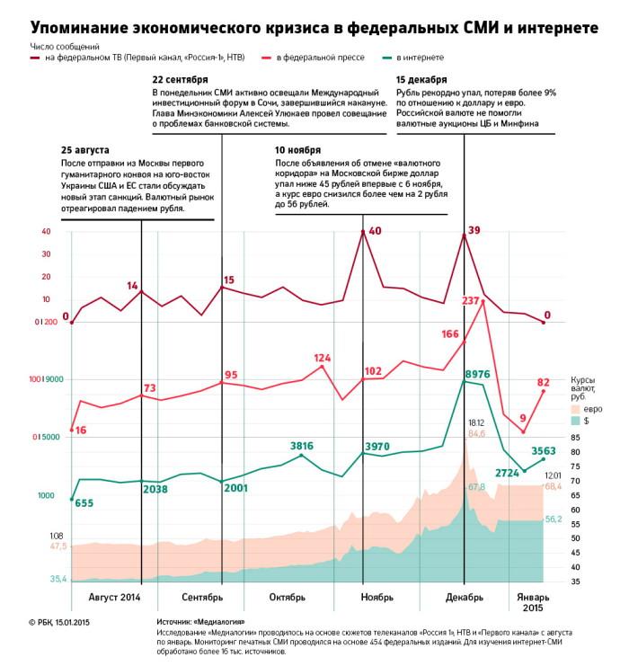 Активно писать о трудностях в экономике печатные СМИ начали в августе – порядка 50 публикаций ежедневно. Всю осень частота сообщений об экономическом кризисе в изданиях постепенно росла. К концу октября о проблемах в экономике писали уже в два раза чаще, чем в начале осени. В ноябре число таких публикаций продолжало плавно расти. С понедельника, 8 декабря, когда ускорилось падение национальной валюты, тема кризиса стала завоевывать полосы газет с резко возрастающей скоростью. К концу месяца количество публикаций о кризисе зашкалило до 250 в день. Тенденция прервалась лишь в праздники, но уже с 5 января газеты стали все чаще возвращаться к кризисной повестке. Такая же динамика и в интернет-СМИ.