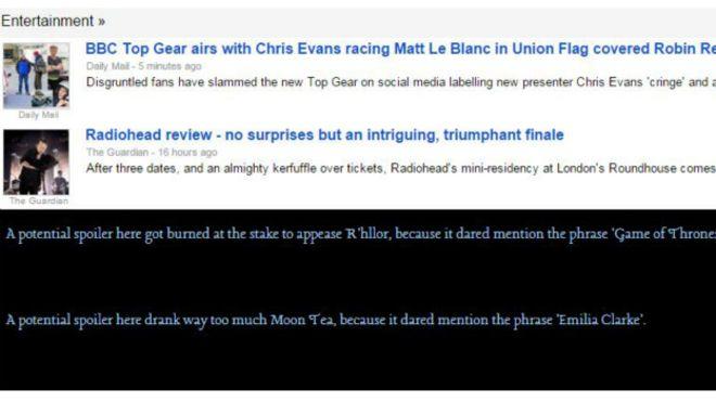 После установки приложения, в социальных сетях можно увидеть, например, такой пост: 'Потенциальный спойлер был безжалостно обезглавлен за дезертирство, потому что осмелился упомянуть фразу 'Игра престолов'.