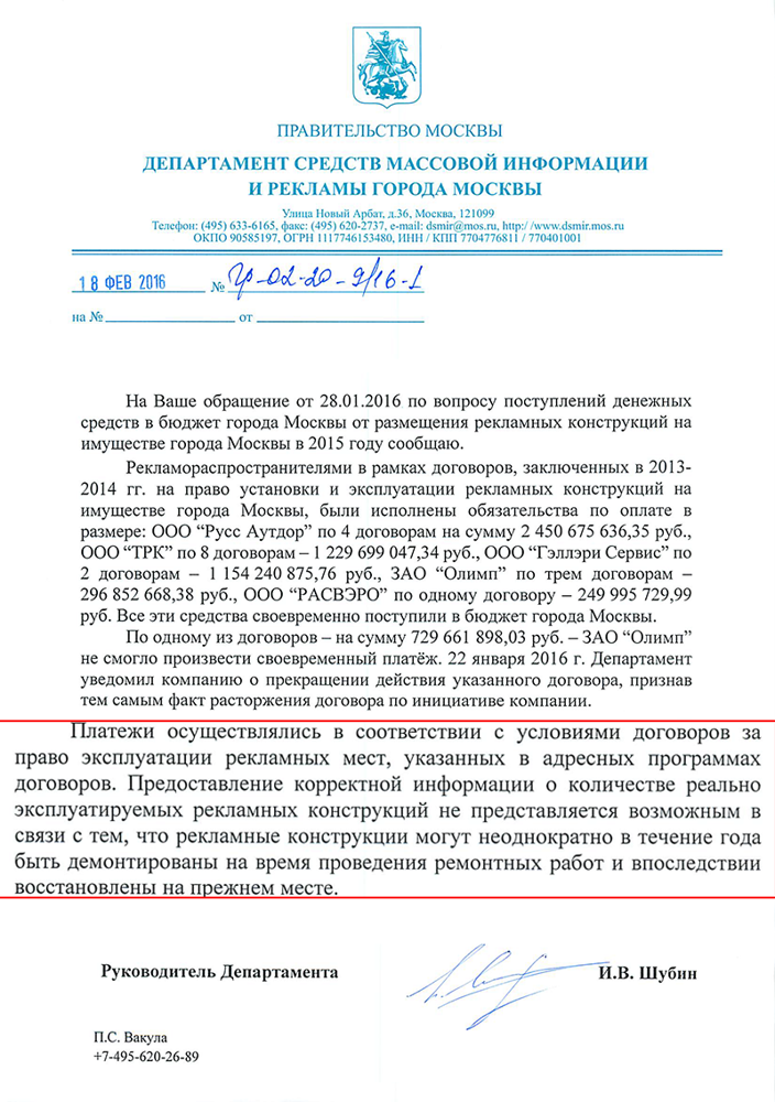 Руководитель столичного департамента СМИ и рекламы Иван Шубин ответил на очередной запрос физического лица о платежах, осуществленных в прошлом декабре победителями рекламных аукционов 2013-2014 годов. Обращение содержало просьбу предоставить информацию не только о суммах, поступивших в бюджет Москвы от каждой компании, но и о количестве реально используемых ими рекламных конструкций.