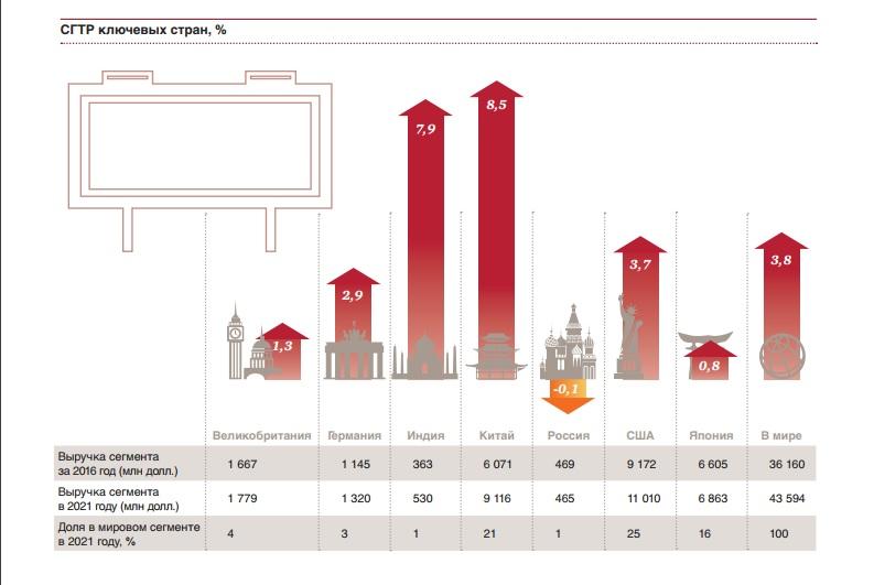 Самыми крупными рынками наружной рекламы стали США ($9,2 млрд) и Япония ($6,6 млрд). При этом, как отмечают авторы отчета, быстрее всех будут расти рынки развивающихся стран: в Китае – на 8,5% и Аргентине – на 8,3%. «До конца прогнозного периода доход от наружной рекламы на физических носителях продолжит расти преимущественно на развивающихся рынках, однако на глобальном уровне он будет неуклонно падать, сдавая позиции наружной рекламе на цифровых носителях», - пишут авторы отчета.