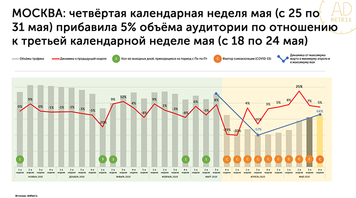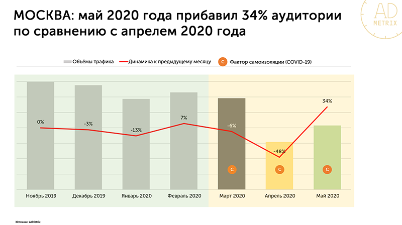 Согласно еженедельному отчету AdMetrix о динамике объемов аудитории в Москве, ограничения, введенные указами мэра Москвы, оказали влияние на рейтинг носителей наружной рекламы уже в марте. Аудитория рекламных носителей снизилась на 6% относительно февраля того же года. Апрель стал самым сложным месяцем для наружной рекламы. В условиях тотальной самоизоляции населения рекламные конструкции потеряли в среднем 48% аудитории. Однако благодаря частичному снятию ограничений в мае аудитория наружной рекламы прибавила 34% по сравнению с апрелем.