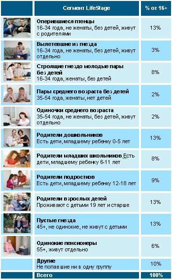 Для построения сегментации LifeStage используются данные о возрасте, семейном положении, наличии и возрасте детей, а также о численности и составе семьи. Всего выделено 12 непересекающихся сегментов (см. таблицу).