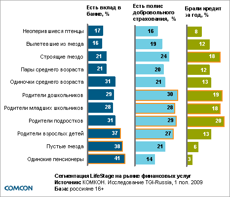 Возьмем в качестве примера предпочтения населения в отношении финансовых услуг.Данные показывают, что вклад в банке чаще всего имеют представители трех сегментов: Пустые гнезда (45+, не одинокие, живут отдельно от детей) – у 38% этой группы есть вклад в банке; Одинокие пенсионеры (55+, живут отдельно от детей) – 41% и Родители взрослых детей (живут с детьми 19 лет и старше) – 37%.Лидерами по наличию полисов добровольного страхования являются семьи с детьми: Родители дошкольников – 30%: Родители подростков – 29%; Родители младших школьников – 28% и Родители взрослых детей – 27%.Основными потребителями кредитов являются Строящие гнездо молодые пары без детей – 18% и Родители детей дошкольного, школьного и подросткового возрастов.