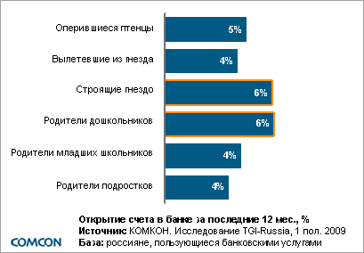 По данным исследования TGI-Russia среди пользователей финансовых услуг самая большая доля людей, открывших счет в банке в течение последнего года, приходится на возрастную группу 24-35 лет (6%). К ней приближается группа 20-24 года (5%).