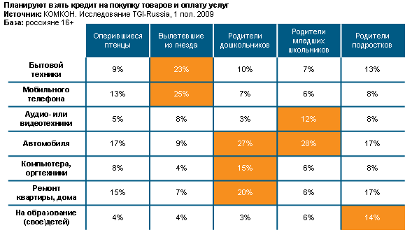 Анализ изменения потребительского поведения россиян на основе сегментации LifeStage показывает, что покупательские предпочтения разнятся в зависимости от потребностей на разных этапах.Так, например, Вылетевшие из гнезда (16-34 года, не женаты, живут отдельно от родителей) планирую взять кредит, в первую очередь, на покупку бытовой техники и мобильных телефонов; Родители дошкольников заинтересованы в кредитах на автомобиль, компьютер или оргтехнику, ремонт. Родители подростков больше других групп нуждаются в кредитах на образование.