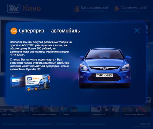 Старт акции состоялся 9-ого сентября, и теперь клиенты автозаправочных станций ТНК получили возможность стать участниками лотереи, в которой будут разыгрываться билеты в кино или суперпризы автомобили Huyndai i30.