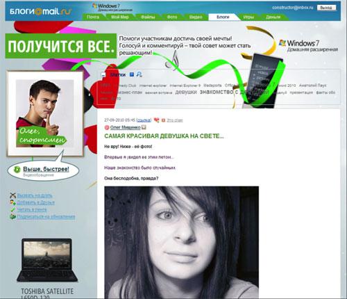 Компания Microsoft, совместно с агентствами UM и Advance Digital запустили проект на портале Mail.ru для бренда Windows. В рамках продвижения новой ОС Microsoft 7 был разработан спецпроект в социальной сети «Мой Мир». Цель проекта - продвижение бренда путем коммуникации с целевой аудиторией «лицом к лицу» в период начала учебного года в естественной для молодежи digital –среде