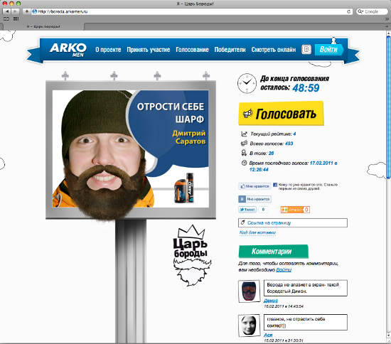Концепт «Царя бороды», как и всей кампании «ARKO. Меняет минусы на плюсы!», разработало креативное агентство Znamenka. Интернет-составляющую обеспечил digital-production «Айлав». «Растит» бороду на видеоборде компания 3STARS/ Медиа-поддержку обеспечивает агентство Ad O’Clock.