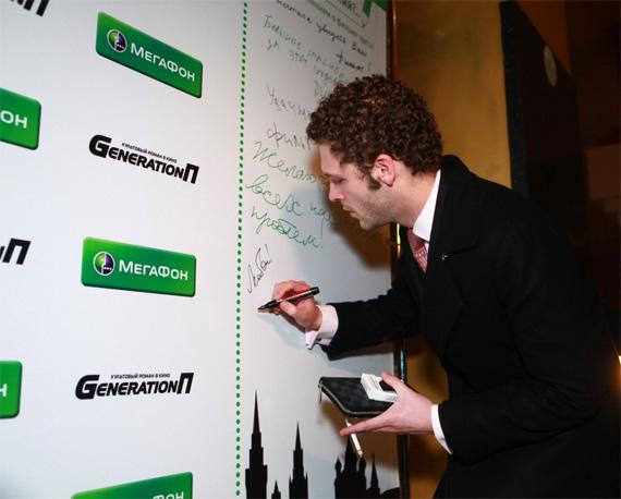 Российский универсальный оператор связи «МегаФон» организовал в фойе киноцентра «Стену пожеланий», на которой посетители премьеры оставили пожелания Виктору Гинзбургу, актерам и самому фильму. Среди фраз, оставленных на стене, были: «Гинзбург – гений!», «Спасибо за столь долгожданную премьеру!», «Я мечтал увидеть ваш фильм!». Все гости, которые сфотографировались на фоне баннера «МегаФона», получили визитки с указанием сайта www.generationp.ru, где они смогут скачать свои фото. «МегаФон» вновь использовал уже ставший фирменным ход – расстелил зеленую ковровую дорожку. Пришедшие посмотреть фильм гости могли воспользоваться брендированным зарядным терминалом для телефонов.