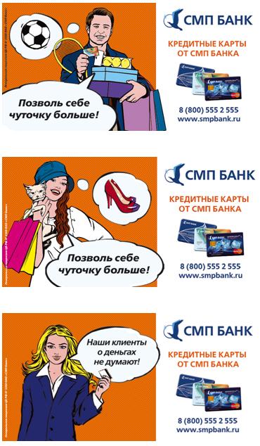 Рекламные послания «Позволь себе чуточку больше!», «Наши клиенты о деньгах не думают!» были направлены на потенциальных держателей карт. Кредитная карта от СМП Банка – удобный способ оплаты товаров и услуг в торгово-сервисных точках по всему миру как собственными, так и кредитными средствами. Кроме того, с ней можно легко и быстро оплатить любые ежедневные расходы, покупки в Интернете, а также снять наличные средства в любое время суток.