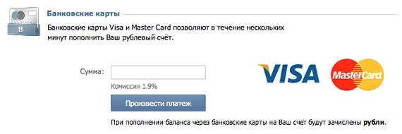 Для приема платежей по картам ВКонтакте использует интернет-эквайринг «Русского Стандарта». При пополнении баланса картой пользователь выплачивает комиссию в размере 1,9%, которую забирает банк. Владельцы карт «Русского Стандарта» комиссию не выплачивают. Всего более 53 000 человек ежемесячно совершают какие-либо операции во «ВКонтакте» при помощи пластиковых карт. За последнюю неделю, используя новую возможность социальной сети, к своим аккаунтам пластиковые карты привязали более 7 000 человек.