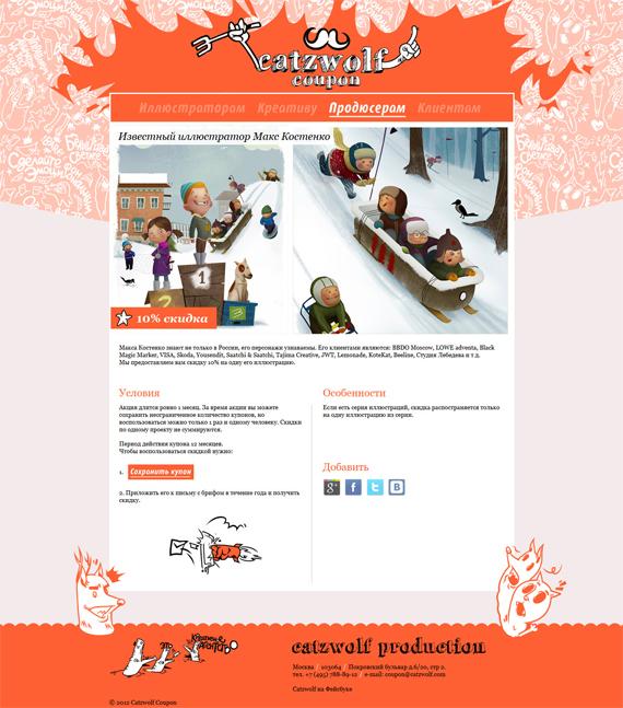 «Кто не любит это волнующее чувство, когда у тебя внезапно появляются лишние деньги? На этой человеческой слабости и делают свой бизнес купонные сервисы. Мы подумали, а разве все наши иллюстраторы, ретушеры аниматоры, арт-байеры, арт-директоры, продюсеры не люди? Да,они сутками сидят в офисе или студии, срастаются с мониторами, и семья их ищет по больницам и моргам. У них почти нет времени, но радости-то остались теми же. Так и появился наш сервис купонов - для профессионалов, которым не чуждо ничто человеческое», – говорит основатель Catzwolf Артем Альтман.