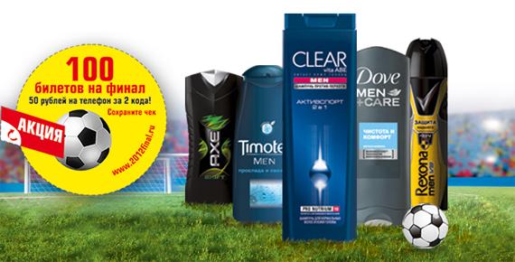 Миллионы российских мужчин с нетерпением ждут финала Чемпионата по футболу, который состоится этим летом. Но уже сейчас каждый из них может вступить в игру, чтобы своими глазами увидеть одно из главных спортивных событий года! Пять брендов Unilever: CLEAR vita ABE Men, Rexona Men, Axe, Dove Men+Care и Timotei Men — проводят совместную промоакцию «Мужская игра с Юнилевер» и разыгрывают 100 поездок на финал Чемпионата.