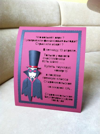 В поддержку радио-ролика накануне пятницы 13 апреля в московском ресторане премиум-класса «Ти-бон» на Ленинском проспекте появится тейбл тент (с англ. table tent, настольные таблички), выполненный в той же стилистике, что и ролик. Ресторан расположен в том же направлении, что и коттеджный поселок. «Привлечь внимание обеспеченного посетителя ресторана премиум-класса непросто. Красивая листовка или буклет для него – обыденность. Нужен разрыв шаблона, - объясняет Светлана Черкашина, - Наши тейбл тенты выполнены вручную, и это дополнительный плюс».