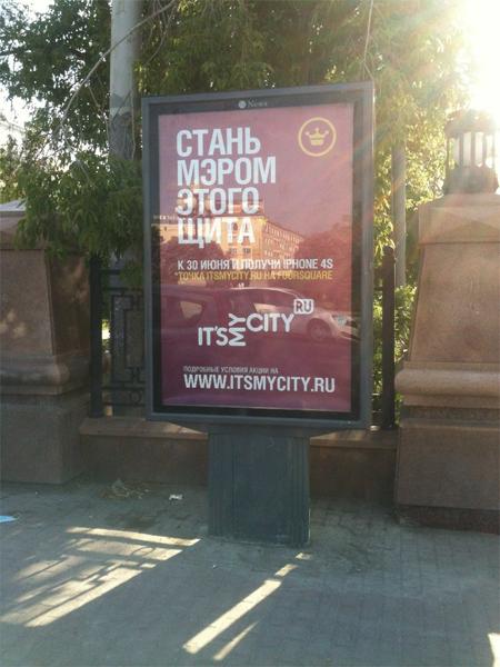 Читателям екатеринбургского блога ItsMyCity.ru в течение месяца предлагают бороться за мэрство рекламного щита в социальной сети foursquare. Для Екатеринбурга рекламные кампании, интегрированные с геолокационным сервисом foursquare непривычны. Раньше за мэрство можно было получить только чашку бесплатного кофе в кофейнях. Сайт ItsMyCity разыгрывает среди читателей iPhone 4S
