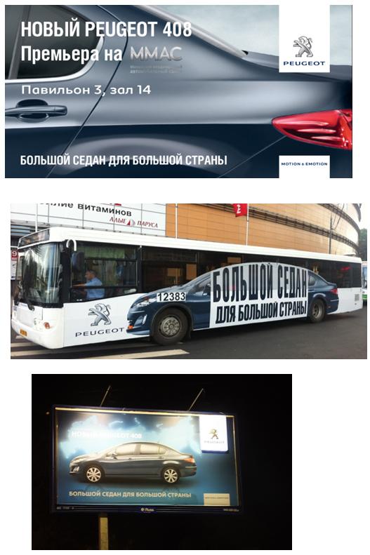 В рамках запуска рекламной кампании Peugeot 408 был задействован широкий микс медиаканалов, подобранный под интересы целевой аудитории нового авто. Основой коммуникации с точки зрения построения охвата стала кампания на национальном телевидении на таких федеральных каналах как Первый, ТНТ, НТВ, ТВ 3, Рен ТВ, Перец, Россия 2 и СТС. Она была поддержана кампанией в наружной рекламе с размещением на стандартных билбордах и суперсайтах с подсвечивающимся экстендером-логотипом. Среди спутникового телевидения были выбраны как каналы популярные больше среди мужской аудитории (например, Драйв, НТВ+Спорт, каналы Лиги Чемпионов), так и каналы для широкой аудитории (TV 1000, Discovery и т.д.) В прессе были использованы в основном автомобильные издания, охватные ТВ гиды, а также глянцевые издания, нацеленные на мужскую аудиторию. Для коммуникации в сети Интернет были использованы наиболее релевантные целевой аудитории площадки с различными форматами – как стандартными Интернет баннерами, так и видео.