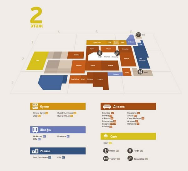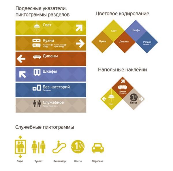 Параллельно в студии для огромного здания мебельного центра разработали удобную навигацию. Продуманная система подкрепляет креативную концепцию уютного дома, в котором всегда знаешь, где что лежит и невозможно потеряться. Классические инструменты: указатели, вывески, информационные стенды в фирменном стиле дополняют специально разработанные для центра пиктограммы, «вязаными» волнистыми линиями рифмующиеся с логотипом «Монарха».