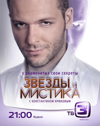Константина Крюкова, который ведет программу о звездах кино, логотип ведет вверх по фиолетовой лестнице, к звездам, к историям полным тайн, мистики и загадки, потому что именно в этом суть программы «Звезды и мистика с Константином Крюковым».
