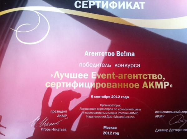 BE!MA признано «Лучшим event-агентством, сертифицированным АКМР»
