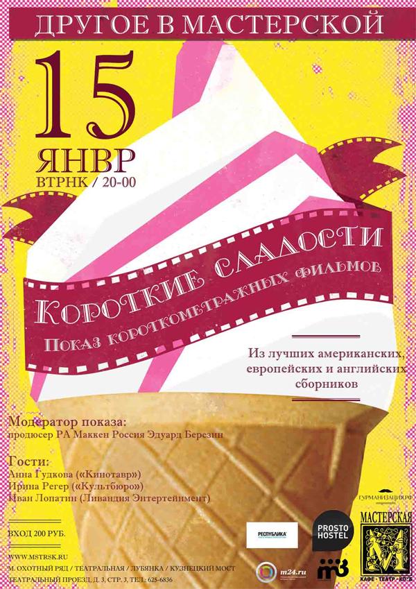 В программе: просмотр короткометражных фильмов из лучших американских, европейских и английских сборников состоится в Театре-клубе «Мастерская» 15 января. Начало семинара в 20-00
