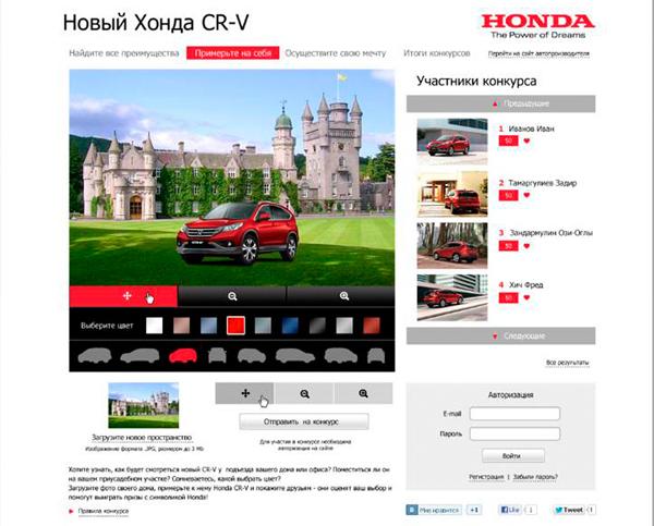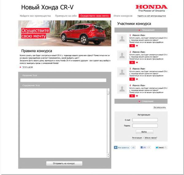 Задача увеличения узнаваемости бренда автомобиля Honda CR-V у потенциальной целевой аудитории была решена за счет комплексной коммуникации. Во-первых, мини-сайта, позволившего пользователям Интернета в увлекательной игровой форме оценить все преимущества кроссовера Honda CR-V нового поколения и почувствовать себя полноправным владельцем новенького автомобиля. А, во-вторых, конкурса на лучшее эссе о том, как лучше провести выходные в компании с Honda CR-V. Самые талантливые и находчивые авторы определялись открытым интернет-голосованием, а в качестве приза - на выходные дни они получали в свое распоряжение автомобиль.