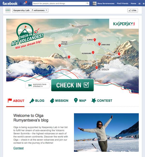 Интернет-агентство «ДАЛЕЕ» запустило международное Facebook-приложение , посвященное путешествию инструктора альпинистского клуба Ольги Румянцевой на семь высочайших вулканов мира при поддержке «Лаборатории Касперского». Зачекиньтесь через приложение на высочайшем вулкане каждого континента, пришлите историю о самом невероятном путешествии, которое хотите совершить, и получите на него билеты от «Лаборатории Касперского»