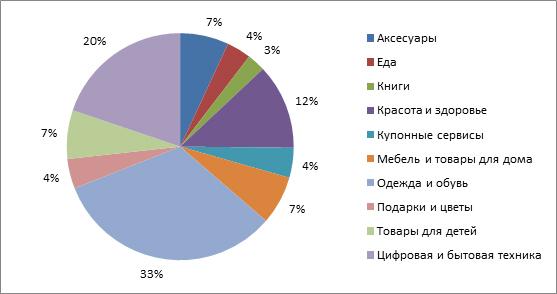 В то же время, если рассматривать сегмент «Интернет-магазины», то наибольшим спросом пользуется категория «одежда и обувь» - 33% от общего числа покупок, на втором месте цифровая и «бытовая техника» - 20%, третье место занимает категория «красота и здоровье» -12%. Как ни странно, наименьшим интересом пользуется категория «еда» - всего 4% , что неудивительно, учитывая низкую осведомленность пользователей о возможностях доставки ресторанной еды на дом.