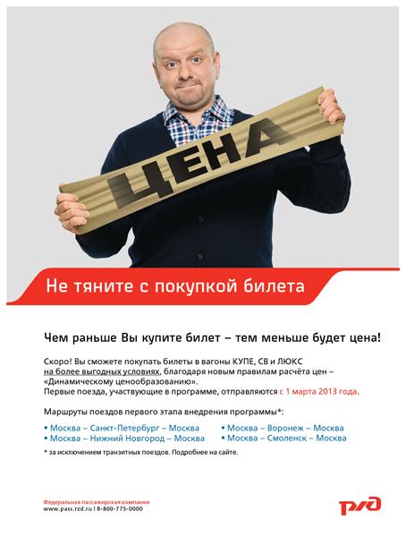 Креативным решением поставленной задачи стало обыгрывание устойчивого выражения «не тяни резину» - на рекламных материалах изображены люди, затянувшие с покупкой билета, тем самым, заплатив за проезд больше, чем могли, если бы побеспокоились об этом заранее. Таким образом, если вы планируете поездку, позаботьтесь о приобретении билета уже сегодня.
