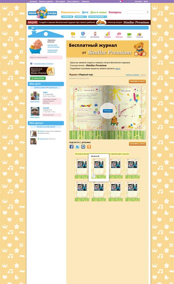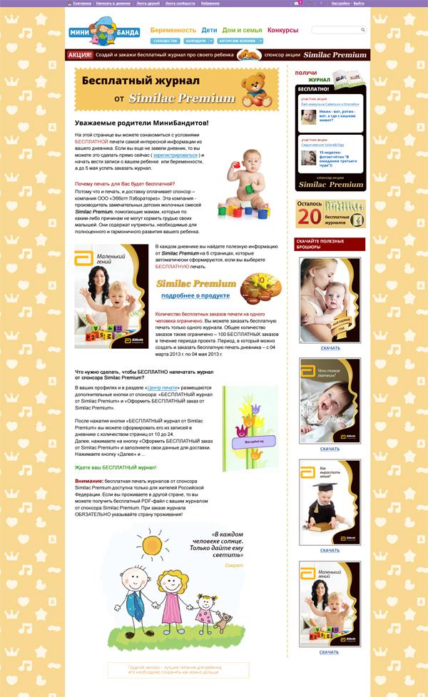 Сайт для молодых родителей www.minibanda.ru запустил проект, спонсором которого выступил бренд детских молочных смесей Similac Premium компании Abbott Nutrition. Суть проекта заключается в том, что мамы, которые зарегистрировались на сайте и ведут онлайн-дневник о своем ребенке, смогут превратить его в глянцевый журнал из 30 страниц в бумажном формате и получить экземпляр журнала по почте совершенно бесплатно.