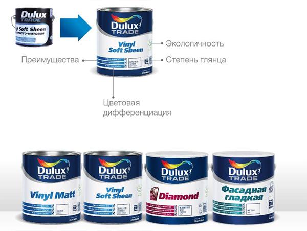 Благодаря новому дизайну выбор краски из любой линейки стал намного удобнее: на банке указано назначение продукта, его степень блеска и подробная информация, необходимая для выбора. Таким образом, Dulux избавляет покупателя от необходимости проводить долгие часы у полок с вопросом, какая же краска ему подойдет и как ее использовать.