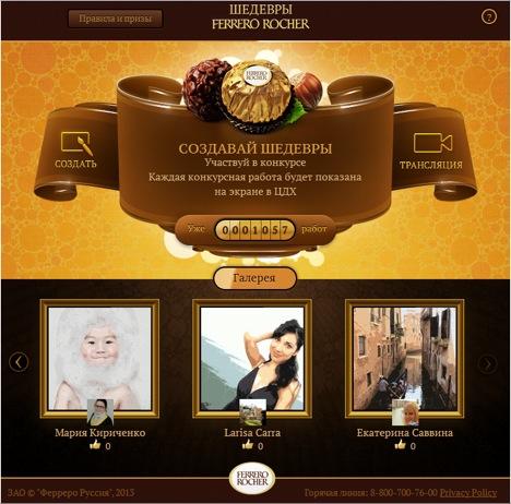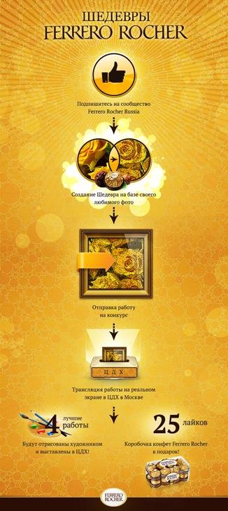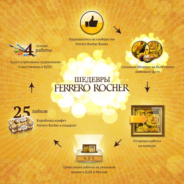 Создать своей собственный шедевр могут все пользователи социальной сети Facebook всего лишь за несколько кликов. Все очень просто: в специальном приложении от FERRERO ROCHER вам нужно лишь загрузить своё любимое изображение. С помощью специально разработанных фильтров даже самая обычная фотография преобразовывается в оригинальную картину. Ей вы можете поделиться с друзьями в ленте, а также пригласить их создать шедевр вместе с вами.