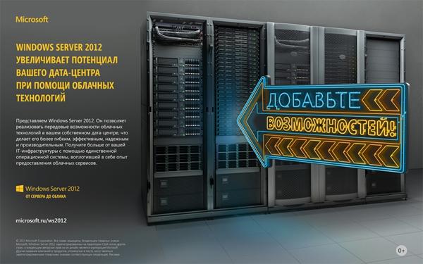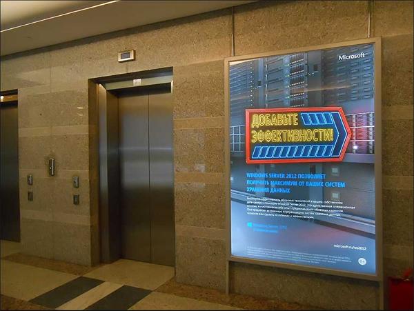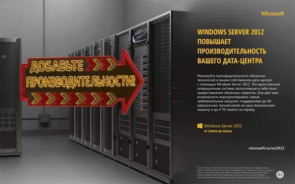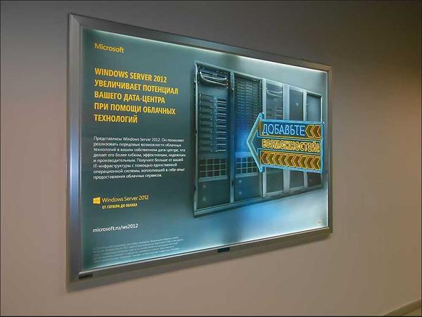 Windows Server 2012 предоставляет широкий выбор функций и возможностей для создания и развития ИТ-инфраструктуры предприятий. Преимущества продукта демонстрируются с помощью серии информационных рекламных макетов, размещенных в бизнес-центрах на ультратонких лайтбоксах. Каждый из макетов акцентирует внимание на каком-то одном из преимуществ операционной системы и содержит призыв к действию: «Добавьте эффективности!», «Добавьте гибкости!», «Добавьте надежности!», «Добавьте производительности!» и «Добавьте возможностей!».