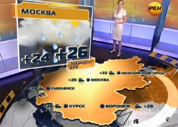В вечерних выпусках программы «Новости 24» в 19:30 на канале РЕН-ТВ во всю летают молнии, проносятся смерчи и ураганы, идут ливни с грозами – все это благодаря трехмерным технологиям. С понедельника по четверг ведущая Метео-ТВ Алена Дублюк, теперь уже в реальном времени, рассказывает телезрителям о превратностях климата. Специально для выпусков прогноза погоды в прямом эфире, телекомпанией Метео-ТВ была изготовлена уникальная модель земного шара с применением технологии Orad – программы, которая позволяет интегрировать человека в трехмерные объекты.
