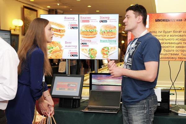 DigiSky Украина показала возможности использования систем Digital Signage в ресторанах – электронное меню, интегрированное с кассовым аппаратом, пред кассовые экраны для клиентов, предлагающие дополнительные блюда и экраны внутри ресторана.