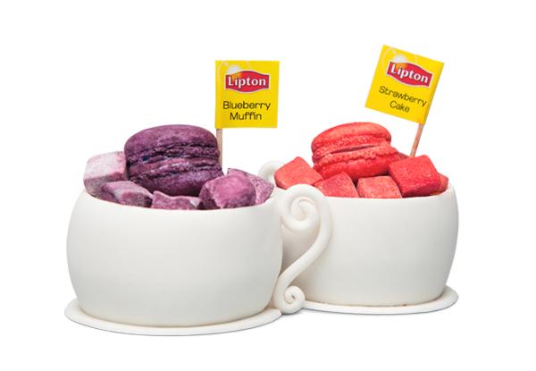 Новые десерты выполнены в виде чайных чашечек, повторяющих образы из рекламного ролика Lipton, и украшены брендированными флажками. Благодаря рецептуре, разработанной специалистами Lipton в сотрудничестве с кондитерами «Шоколадного ателье», угощения имеют узнаваемые вкусы чаев Lipton Black Tea Blueberry Muffin и Lipton Green Tea Strawberry Cake.