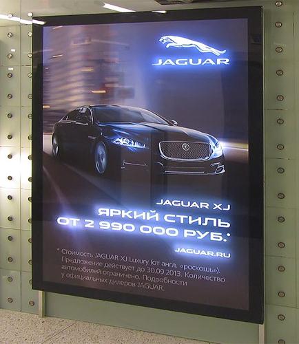Ее основная особенность – возможность анимации рекламного постера с помощью программы управления подсветкой. Первым клиентом, выкупившим носитель для своего продвижения, стал бренд Jaguar, рекламная кампания которого сейчас проходит в бизнес-центрах.