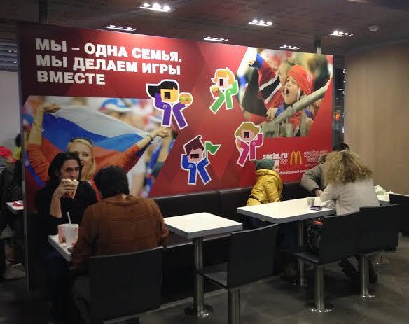 Идея «Мы одна семья. Мы делаем игры вместе» также воплотилась в олимпийской стилистике ресторанов «Макдоналдс» в виде оригинальных пиктограмм-болельщиков, разработанных TNC.Brands.Ads. Этот декор «Макдоналдс» использовал при оформлении 400 обычных и 22 флагманских ресторанов, 5 из которых находятся в г. Сочи.