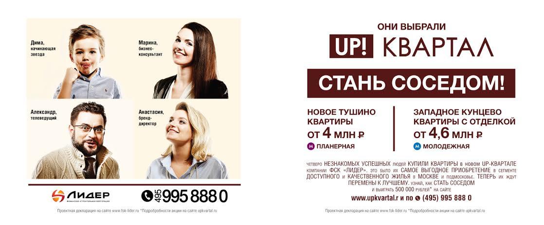 Героями рекламной кампании стали покупатели квартир в UP-кварталах «Западное Кунцево» и «Новое Тушино», пятеро успешных, позитивных, красивых людей разных профессий. Среди них есть и начинающий артист, и бизнес-консультант, и успешный рекламщик, и бренд-директор крупного холдинга и даже известный телеведущий