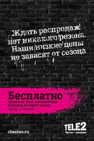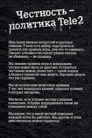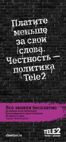 Во всех коммуникациях с абонентами Tele2 сделала ставку на принципы честности и простоты, информируя пользователей обо всех без исключения условиях оказания услуг. Для реализации идеи честности в телевизионной рекламе компания использует силу музыки и стихов. Главные герои новой концепции Tele2 – группа молодых музыкантов, которые участвуют в рекламе под своими настоящими именами. Их творчество – честные, остроумные тексты, музыка и острые рифмы, доносящие идеи Tele2. Они борются за прямоту в общении и честность. Они говорят правду в своих ироничных песнях, разоблачают обман в жизни и строго оценивают даже самих себя. В наружной рекламе оператор использует все пространство щитов для размещения тарифного предложения, отказавшись от звездочек и мелкого шрифта, содержащих множество ограничений по использованию услуг.